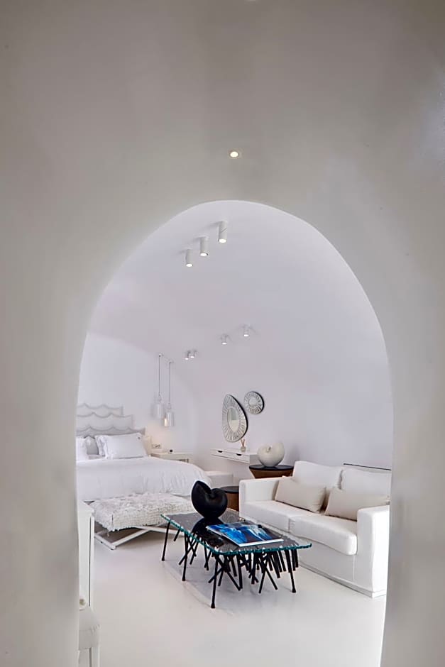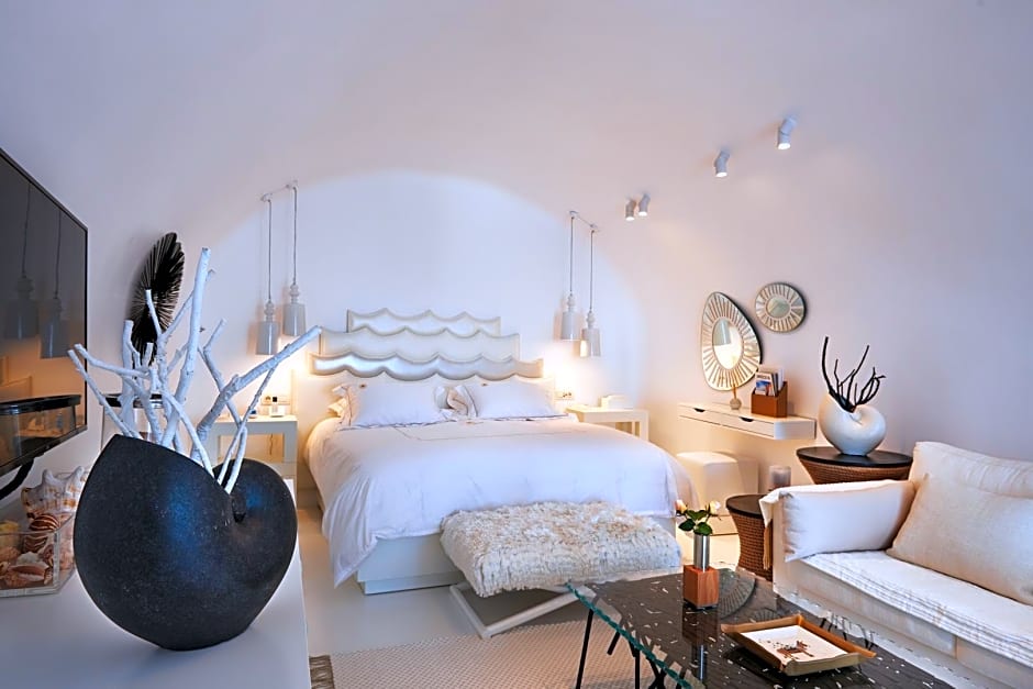 The Master Suite offers a spacious bedroom with a king-size bed, a generous living room, and a bathroom equipped with a refreshing rain shower. This suite is tastefully decorated with a unique artistic style and inspired furnishings. Take a dip in your private infinity pool or bask in the sun on the loungers while relishing the magnificent views of the Volcano, the Caldera, and the Aegean Sea.